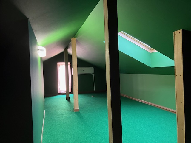 アフター編屋根裏部屋の壁のクロスも床のカーペットも同じグリーン系でまとめたのは、お客様のこだわりでした。 生まれ変わった部屋に大満足のご様子です。 弊社も低い天井で姿勢に苦労しましたが、感謝です。 (2025.8.7[Thu])
